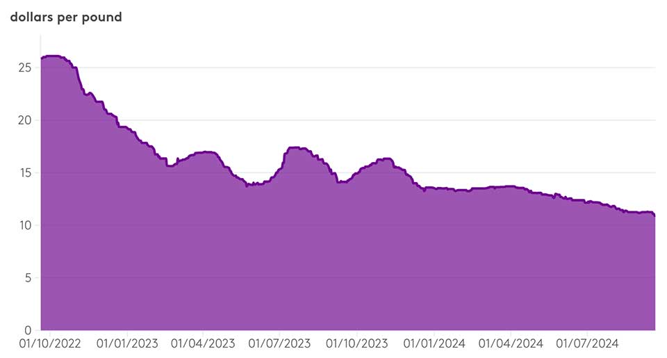 السوق مغمور بالمعدن الأزرق بسبب زيادة الإنتاج الهائلة من قبل شركات التعدين الصينية في جمهورية الكونغو الديمقراطية. زادت شركة واحدة على وجه الخصوص ، سيموك ، الإنتاج في النصف الأول من عام 2024 بنسبة 178٪.