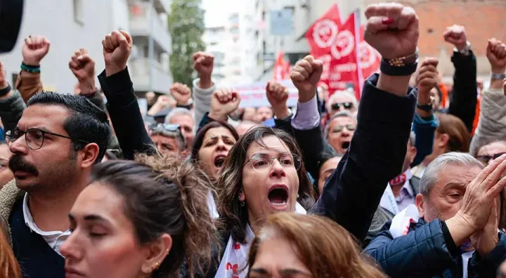 مئات من الأتراك ينزلون إلى الشوارع للاحتجاج على اعتقال عمدة إسطنبول ومرشح الرئاسة عن حزب الشعب الجمهوري التركي (CHP)، أكرم إمام أوغلو، في إزمير، تركيا، في 19 مارس 2025. (صورة بواسطة بيركجان زينجين / صور الشرق الأوسط / صور الشرق الأوسط عبر وكالة الصحافة الفرنسية)