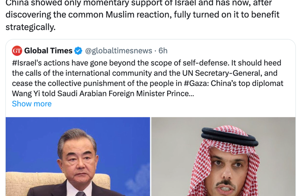 ولم تظهر الصين سوى دعم مؤقت لإسرائيل، والآن، بعد اكتشاف رد الفعل الإسلامي المشترك، انقلبت عليها بالكامل لتحقيق الاستفادة الاستراتيجية.