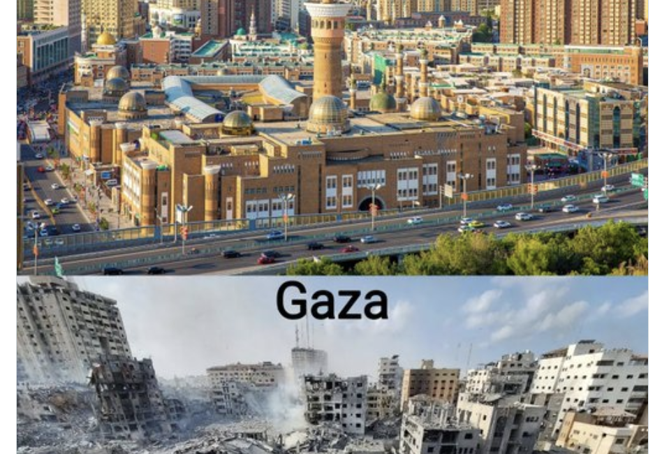 أثارت سفارة الصين في فرنسا ضجة على الإنترنت من خلال نشر صورة تقارن بين غزة وشينجيانغ. يُظهر الميم، الذي يحمل عنوان "بدون عنوان"، صورة لشارع تم قصفه في غزة جنبًا إلى جنب مع شارع سليم ويبدو مزدهرًا في شينجيانغ.