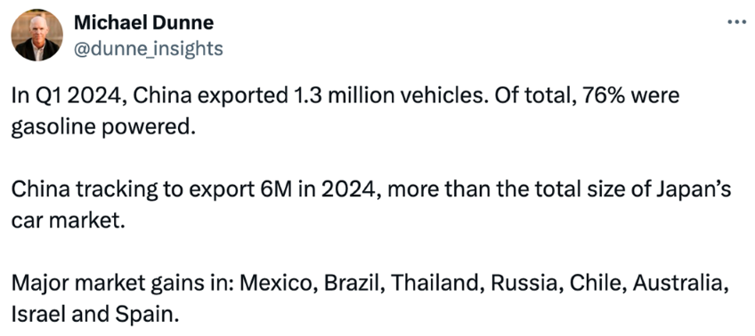 في الربع الأول من عام 2024 ، صدرت الصين 1.3 مليون سيارة. من المجموع ، كان 76 ٪ يعمل بالبنزين. تتبع الصين لتصدير 6M في عام 2024 ، أي أكثر من الحجم الإجمالي لسوق السيارات في اليابان.