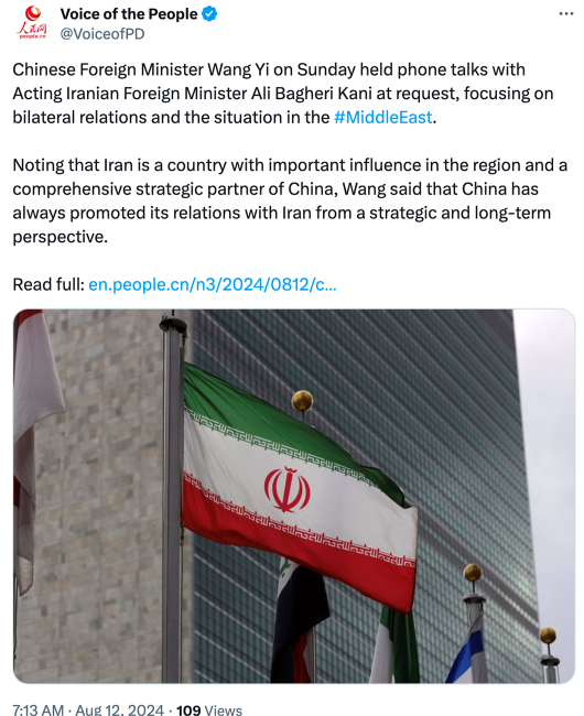 أجرى وزير الخارجية الصيني وانغ يي يوم الأحد محادثات هاتفية مع القائم بأعمال وزير الخارجية الإيراني علي باقري كاني بناء على طلبه، ركزت على العلاقات الثنائية والوضع في الشرق الأوسط.