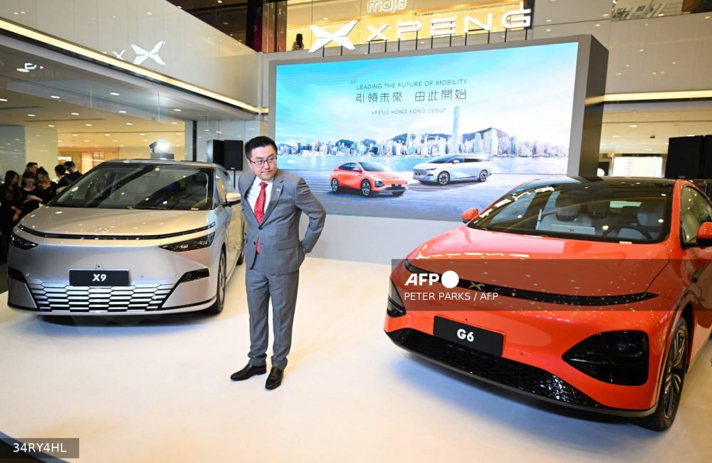 يستعد برايان جو، الرئيس المشارك لشركة اكسبينج .، لالتقاط صورته بجوار سيارات Xpeng G6 وX9 الكهربائية في هونغ كونغ في 17 مايو 2024 أثناء إطلاق مركبات اكسبينج في المدينة لأول مرة. (تصوير بيتر باركس/ وكالة الصحافة الفرنسية)
