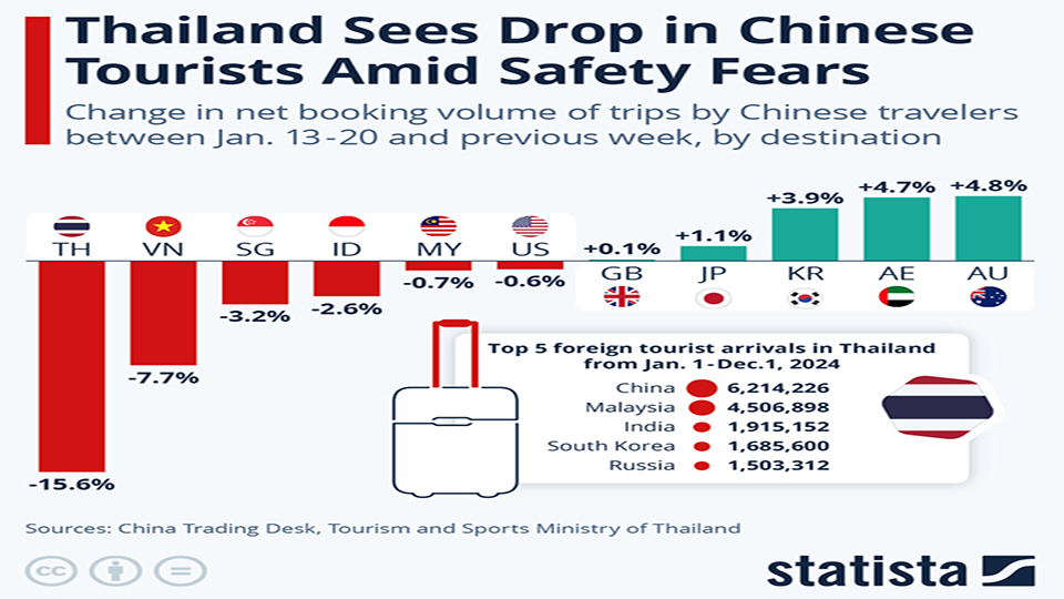 يظهر رسم بياني جديد كيف أثرت الفضائح الأخيرة حول تهريب الزوار الصينيين إلى تايلاند إلى عصابات الاحتيال في ميانمار على السياحة إلى المنطقة.