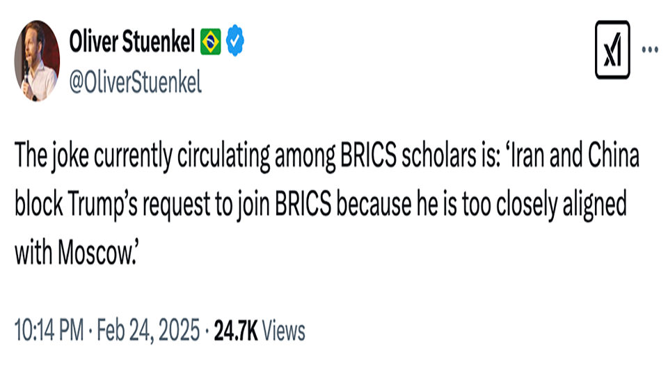 النكتة المتداولة حاليا بين علماء البريكس هي: "إيران والصين تعرقلان طلب ترامب للانضمام إلى بريكس لأنه متحالف بشكل وثيق مع موسكو".