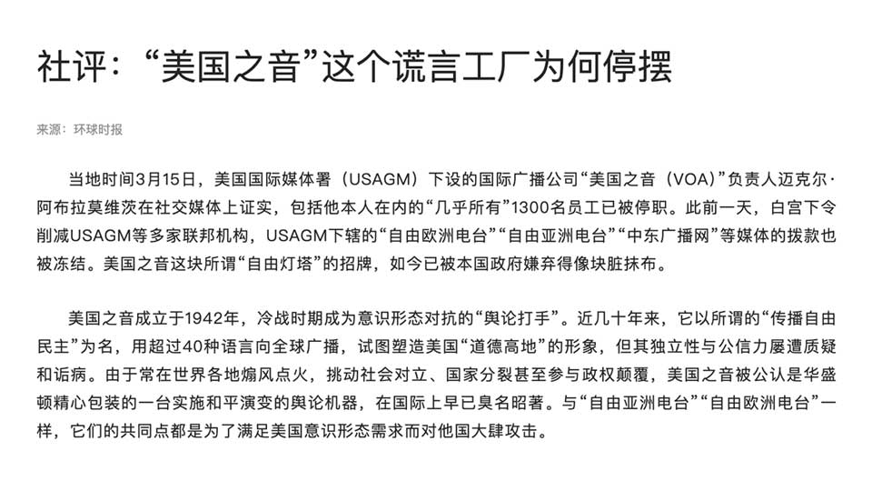 بالنسبة للرئيس الأمريكي وداعميه من أنصار "ماغا"، كانت وكالة الإعلام الأمريكية العالمية مجرد "أشخاص مجانين من اليسار الراديكالي يتحدثون مع أنفسهم." ولكن إذا كان الأمر كذلك بالفعل، فلماذا كانت "غلوبال تايمز" قد كتبت الافتتاحية التي كتبتها يوم الإثنين؟ ما يبدو أن ترامب وإيلون ماسك وحلفاءهم لا يقدرون عليه هو كم من التغطية الإعلامية من صوت أمريكا وإذاعة آسيا الحرة كانت تزعج الصينيين (والروس) — أو ربما كانوا يعرفون ذلك.