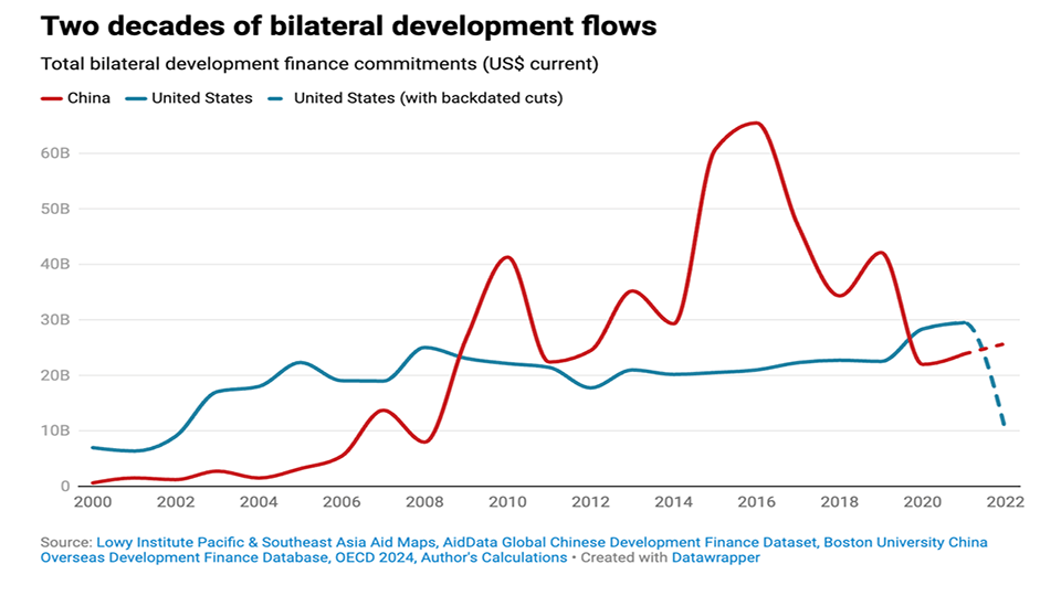 بينما تهيمن التأثيرات الإنسانية والصحية على التغطية الإعلامية لتعليق المساعدات الخارجية الأمريكية بشكل مفاجئ، يبقى من الصعب تتبع كيفية تأثير ذلك على النفوذ العالمي للولايات المتحدة. إلا أن شيئًا واحدًا واضحًا: هو أن هذا الأمر زاد من أهمية الصين كشريك في التنمية. وقد تم قياس ذلك في دراسة جديدة مثيرة أعدها معهد "لووي" التي جمعت خمس مجموعات بيانات مختلفة حول التفاعل التنموي للصين وقارنتها بنفوذ الولايات المتحدة: