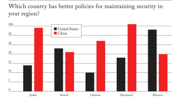 - الصين ليست أفضل حالا: "أكثر من نصف المستجيبين (50.1٪) لديهم إما "ثقة ضئيلة" (34.8٪) أو "لا ثقة" (15.3٪) في الصين للقيام "بالشيء الصحيح" في المساهمة في السلام والأمن والازدهار والحكم العالمي. الربع فقط (24.8٪) إما "واثقون" أو "واثقون جدا" من أن الصين ستساهم بشكل إيجابي.