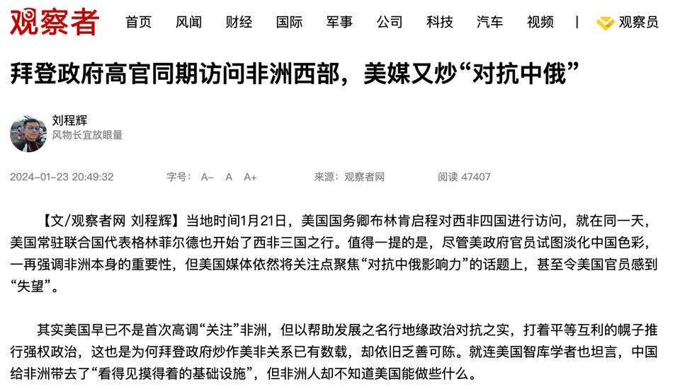 جوانشا: كبار مسؤولي بايدن يزورون أفريقيا وسط تكهنات وسائل الإعلام الأمريكية حول "مواجهة روسيا والصين" بقلم ليو تشنغ هوي (بالصينية)