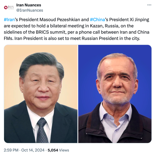 وبالإضافة إلى الصراع الإقليمي المتصاعد، ناقش الاثنان أيضا اجتماعا محتملا بين الرئيس الصيني شي جين بينغ ونظيره الإيراني مسعود بيزيشكيان على هامش قمة بريكس الأسبوع المقبل في روسيا.