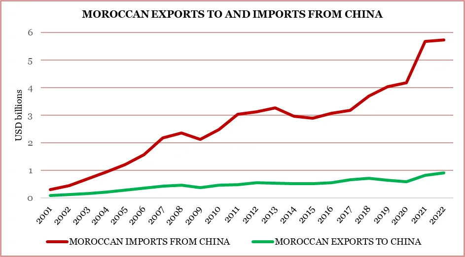 على سبيل المثال، أكدت صحيفة بيان اليوم، التابعة لحزب التقدم الاشتراكي، أن مذكرة التفاهم والاتفاقيات المرتبطة بها تمثل حقبة جديدة من التعاون الثنائي مع الصين باعتبارها الشريك التجاري الأكثر أهمية للمغرب في آسيا. 1 ولا ينبغي أن يعزى هذا الاحتفال إلى فقط للميل اليساري للصحيفة، وفقًا لـ "مؤشر الاستثمار العالمي الصيني 2023" الصادر عن مجلة الإيكونوميست، أصبح المغرب ثالث أكثر دولة في أفريقيا جاذبية للاستثمارات الصينية، بعد مصر وجنوب إفريقيا فقط، والمرتبة 33 عالميًا.