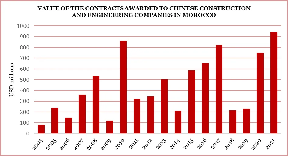 وفقًا لبيانات تشاينا ميد ، شهدت الصادرات الصينية إلى المغرب ارتفاعًا كبيرًا على أساس سنوي، خاصة بين عامي 2020 و2021. وكان عام 2021 أيضًا عامًا قياسيًا لشركات البناء والهندسة الصينية حيث وقعت عقودًا بقيمة تقارب مليار دولار أمريكي في عام 2021. المغرب. وفي الأشهر الأخيرة، أشاد المعلقون المغاربة باستمرار بالمشاريع التي بنتها و/أو تمولها الصين باعتبارها معالم مهمة. على سبيل المثال، في يونيو 2023، وقع المغرب وشركة جوتشن هاي تيك مذكرة تفاهم بقيمة 6.4 مليار دولار أمريكي لبناء "جيجا فاكتوري" لبطاريات السيارات الكهربائية بالقرب من الرباط. 2 ومن الأمثلة الأخرى على ذلك خط السكك الحديدية الثاني عالي السرعة في المغرب، المخطط لربط الدار البيضاء وأكادير، والذي مُنحت مسودة الدراسات الأولية إلى شركة تصميم السكك الحديدية الصينية في يوليو 2023 (كانت شركة شركة سنسف الفرنسية الشريك وراء أول خط السكك الحديدية عالية السرعة في المغرب ولكن بسبب التوترات السياسية، لم تقدم عرضًا للخط الجديد). 3 في كوريا وألمانيا، من المرجح أن يتم إسناد بناء خط HSR الجديد إلى شركة بناء السكك الحديدية الصينية ، التي سبق لها أن أنجزت جسر محمد السادس في الرباط. 4