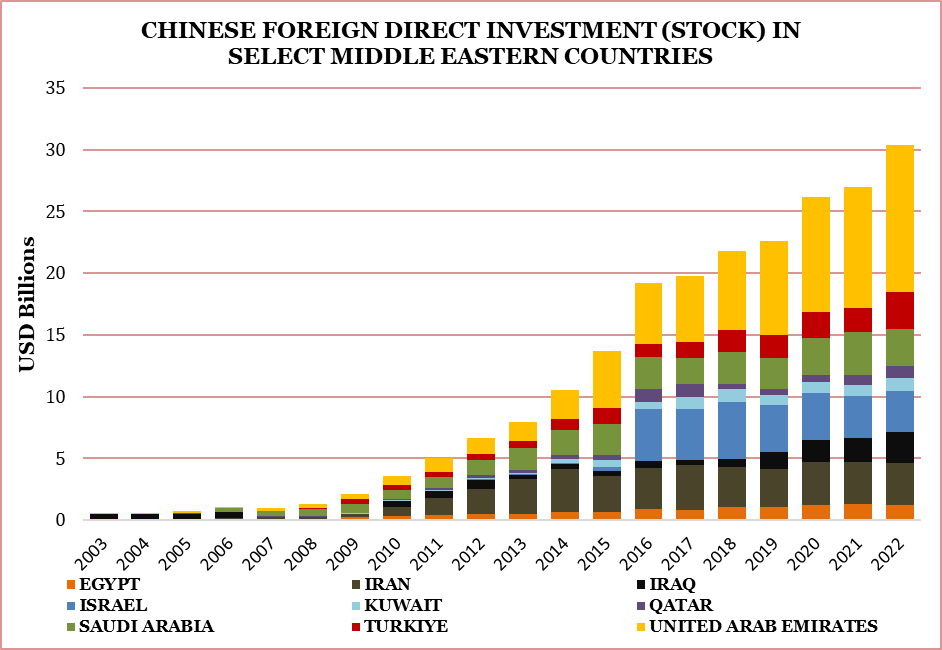 وبينما شهد الشرق الأوسط ككل طفرة في الاستثمار الصيني في عام 2022، فإن التقريب يكشف أنه لم تشهد جميع دول الشرق الأوسط ارتفاعًا في قيمة مخزون الاستثمار الأجنبي المباشر الصيني. حتى أن العديد من البلدان، بما في ذلك مصر والمملكة العربية السعودية، شهدت انخفاضًا في مخزونات الاستثمار الأجنبي المباشر الصيني في عام 2022.