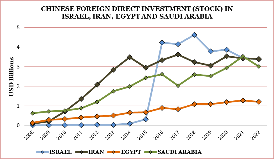 شهدت إسرائيل، على وجه الخصوص، انخفاض مخزون الاستثمار الأجنبي المباشر الصيني إلى أدنى مستوى له منذ سبع سنوات عند 3.4 مليار دولار أمريكي في عام 2022، بانخفاض عن ذروته في عام 2018 البالغة 4.6 مليار دولار. وكما هو موضح في تقريرنا لعام 2022، تواجه تل أبيب ضغوطًا متزايدة من واشنطن للحد من علاقاتها الاقتصادية والعلمية مع بكين. ورداً على ذلك، أنشأت إسرائيل اللجنة الاستشارية لتقييم جوانب الأمن القومي للاستثمارات الأجنبية. وفقًا لمقالة كتبها عساف جلعاد عام 2022 لصحيفة جلوبز الإسرائيلية، كانت جهود هذه اللجنة مسؤولة عن انخفاض كبير في الاستثمارات الصينية وسحب الكثير من رأس المال الصيني من البلاد.