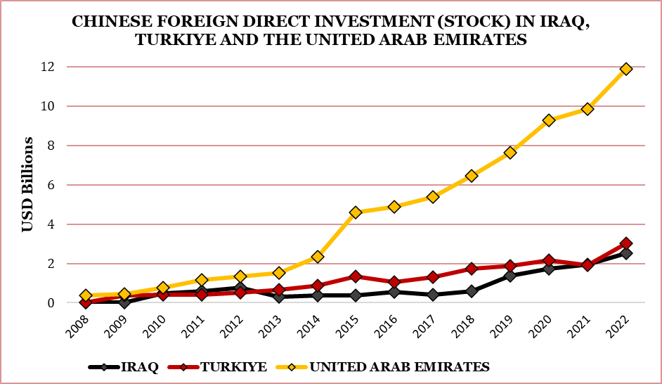 وعلى الرغم من الانخفاضات المسجلة في البلدان المذكورة أعلاه، فإن القيمة الإجمالية لمخزون الاستثمار الأجنبي المباشر الصيني في الشرق الأوسط ارتفعت بسبب الزيادات الهائلة في دول مختارة في الشرق الأوسط. على سبيل المثال، شهد العراق ارتفاعًا طفيفًا من 1.9 مليار دولار أمريكي إلى 2.5 مليار دولار أمريكي. ويمكن أن تعزى هذه الزيادة إلى اهتمام بكين المستمر بالاستثمار في النفط العراقي واستهلاكه وما يسمى بصفقة "النفط مقابل إعادة الإعمار" بين الصين والعراق لعام 2019.