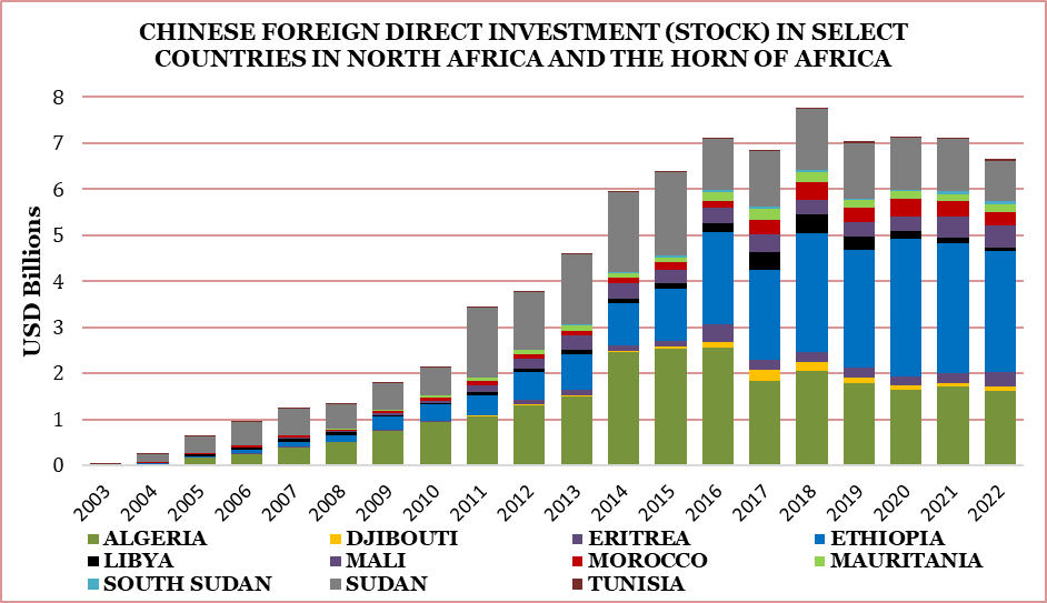 يعد استمرار العنف وعدم الاستقرار في جميع أنحاء شمال إفريقيا والقرن الإفريقي في عام 2022 من أكثر العوامل المحتملة التي ساهمت في ركود وتراجع قيمة مخزون الاستثمار الأجنبي المباشر الصيني في هذه المنطقة من العالم. خلال عام 2022، وصلت حرب تيغراي إلى ذروتها الوحشية، واندلع القتال في طرابلس، وشهد السودان عدم استقرار متزايد في أعقاب انقلاب أكتوبر 2021، مما أدى في النهاية إلى اندلاع الحرب الأهلية في أبريل 2023.