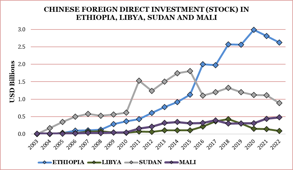 ومن اللافت للنظر، وسط الاضطرابات السياسية والأمنية الناجمة عن انقلاب مايو 2021 في مالي والطرد اللاحق للمهمة العسكرية بقيادة فرنسا "عملية برخان"، برزت مالي كواحدة من الدول القليلة في هذه المنطقة دون الإقليمية التي شهدت زيادة في الاستثمار الأجنبي المباشر الصيني. المخزون في عام 2022، ليرتفع من 439 مليون دولار أمريكي إلى 478 مليون دولار (قد يكون التفسير المحتمل هو عمليات الاستحواذ والاستثمارات الصينية المستمرة في مناجم الليثيوم في مالي).