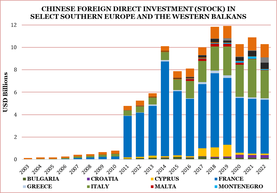 وإيطاليا ليست الدولة العضو الوحيدة في الاتحاد الأوروبي التي تتبنى موقفا أكثر عدائية بشأن التعامل الاقتصادي مع الصين. وقد يكون هذا التحول في المواقف داخل الاتحاد الأوروبي وراء اهتمام الشركات الصينية المتزايد بدول غرب البلقان من خارج الاتحاد الأوروبي. وشهدت صربيا، على وجه الخصوص، طفرة سريعة في الاستثمار الأجنبي المباشر الصيني الذي وصل إلى مستوى قياسي بلغ 557 مليون دولار أمريكي في عام 2022. والجدير بالذكر أن الشركات الصينية توجه استثماراتها إلى قطاعات التعدين وتصنيع المعادن والسيارات الصربية.