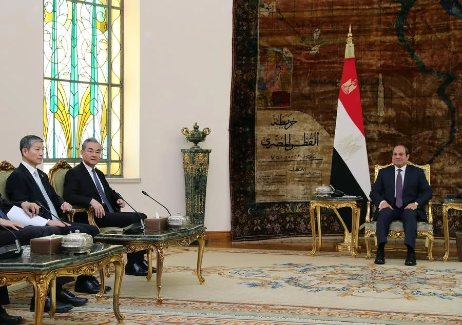 الرئيس المصري عبد الفتاح السيسي يعقد اجتماعا مع وزير الخارجية الصيني الزائر وانغ يي، عضو المكتب السياسي للجنة المركزية للحزب الشيوعي الصيني، في القاهرة، مصر، 14 يناير 2024 ((شينخوا/ وانغ دانزين)