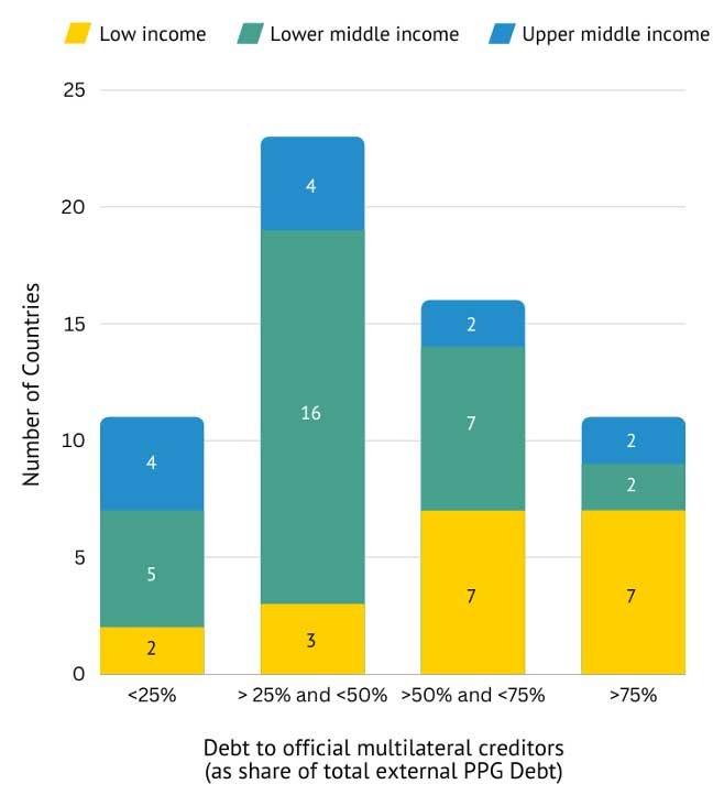 وعلى الرغم من الاعتقاد الخاطئ بأن الصين هي الدائن الرئيسي للبلدان المثقلة بالديون، فإن الواقع هو أن حاملي السندات وبنوك التنمية المتعددة الأطراف هم الدائنون الرئيسيون لهذه البلدان إلى حد بعيد. من بين 61 دولة تم تحديدها على أنها بحاجة إلى تخفيف أعباء الديون، تدين 27 منها بأكثر من 50% من ديونها العامة والمضمونة من قبل الحكومة لدائنين متعددي الأطراف، كما هو مبين في الشكل 1. وهذا يعني أنه إذا لم تشارك بنوك التنمية المتعددة الأطراف في تخفيف أعباء الديون ولن يكون لدى هذه البلدان القدر الكافي من إعادة هيكلة الديون لاستعادة القدرة على تحمل الديون. علاوة على ذلك، وبالنظر إلى أن العديد من البلدان المنخفضة الدخل تقترض في الغالب من بنوك التنمية المتعددة الأطراف، كما هو موضح في الشكل 1، فإن الافتقار إلى مشاركة بنوك التنمية المتعددة الأطراف سيؤثر بشكل خاص على البلدان الأكثر ضعفا.