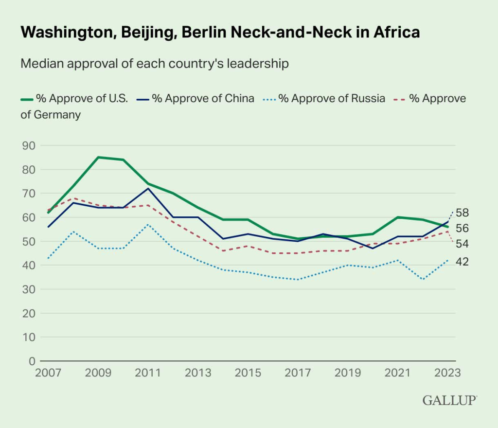 أصدرت مؤسسة غالوب استطلاعا جديدا للرأي العام يظهر ، للمرة الثانية هذا الشهر ، مكاسب صينية قوية وخسائر أمريكية كبيرة في المناطق الرئيسية ، بما في ذلك إفريقيا وجنوب شرق آسيا.