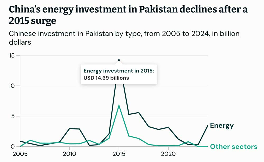 بين عامي 2005 و2024، استثمرت الصين ما يقرب من 68 مليار دولار في اقتصاد باكستان، وكان قطاع الطاقة هو المهيمن بنسبة 74% من محفظة الاستثمارات. بلغت هذه الاستثمارات ذروتها في عام 2015 كجزء من ممر الصين-باكستان الاقتصادي (CPEC)؛ وهو مشروع رئيسي ضمن مبادرة الحزام والطريق التي أطلقها الرئيس شي جين بينغ.