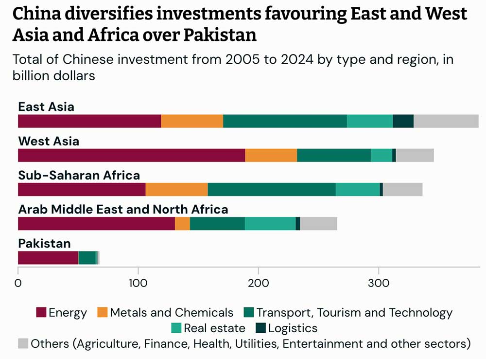 لقد قامت الصين بتنويع اهتماماتها الاستثمارية في السنوات الأخيرة، حيث قامت بإعادة تخصيص رأس المال بعيداً عن باكستان، مفضلة الشرق الأوسط ومنطقة جنوب الصحراء الكبرى في أفريقيا وشرق أفريقيا، حيث استؤنف الاستثمار بعد جائحة كوفيد أو تجاوز مستويات ما قبل الجائحة.
