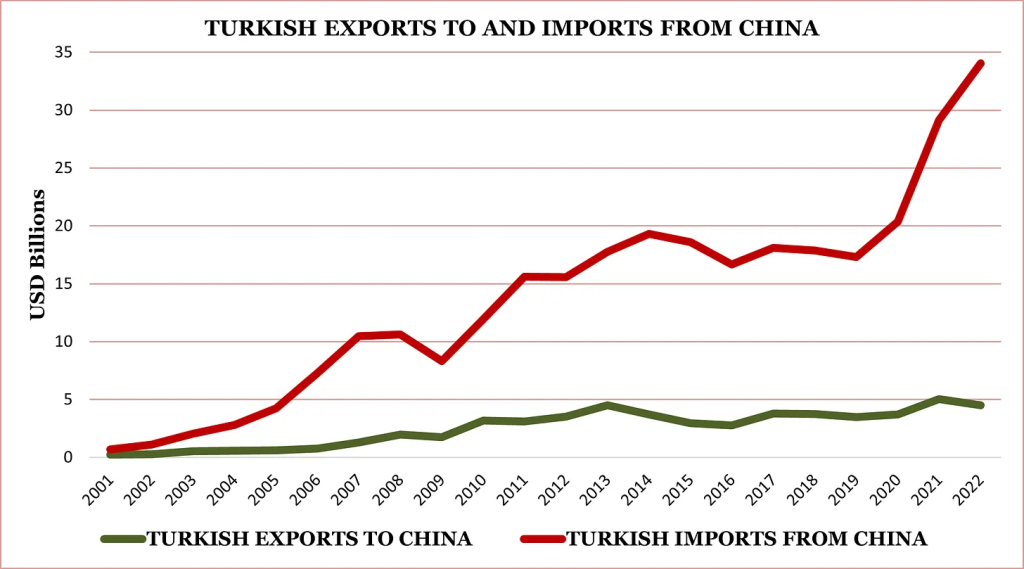 وأظهر قرار تركيا بالانضمام إلى مبادرة الحزام والطريق في عام 2015 التزامها بمواصلة المواءمة مع استراتيجية تمويل البنية التحتية العالمية للصين. وفي حين حققت هذه الشراكة نتائج إيجابية، فقد شهدت السنوات الأخيرة مخاوف متزايدة في تركيا بشأن تزايد الاختلال التجاري الثنائي. وفقًا لبيانات تشاينا ميد,، صدرت تركيا سلعًا بقيمة 4.5 مليار دولار أمريكي إلى الصين في عام 2022، في حين بلغت وارداتها من الجمهورية الشعبية مبلغًا مذهلاً قدره 34 مليار دولار أمريكي.