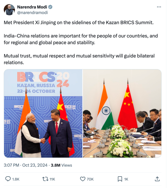 والتقى الرئيس الصيني شي جين بينغ ورئيس الوزراء الهندي ناريندرا مودي على هامش اجتماع لمجموعة بريكس في روسيا، وهو أول اجتماع رسمي بينهما منذ خمس سنوات.