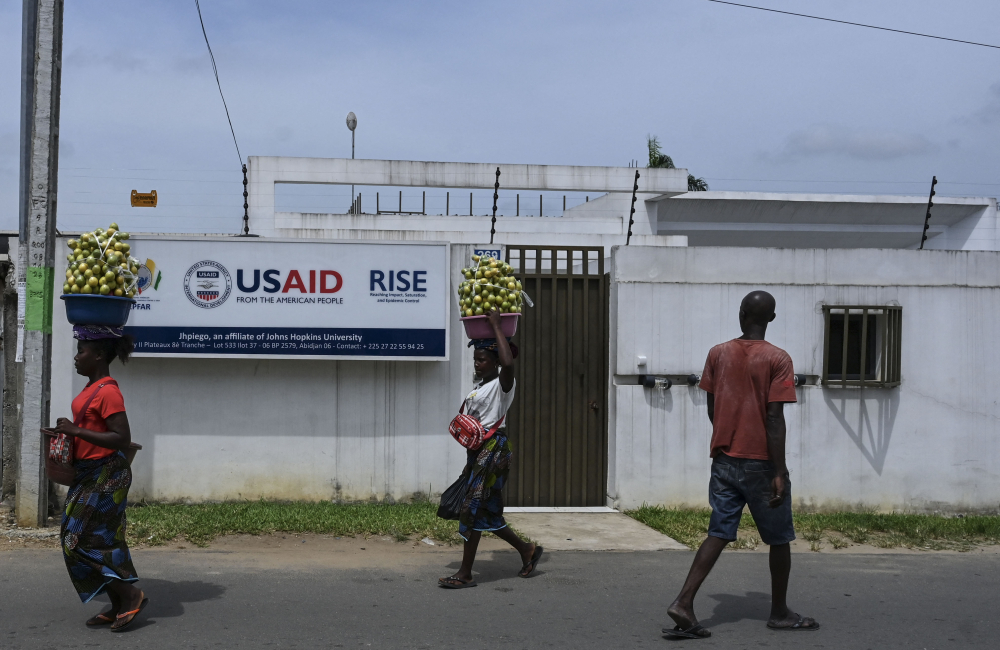 الباعة الجائلون يمشون أمام مكتب الوكالة الأمريكية للتنمية الدولية (USAID) في أبيدجان في 22 مارس/آذار 2025. (تصوير إيسوف سانوغو / وكالة الصحافة الفرنسية)