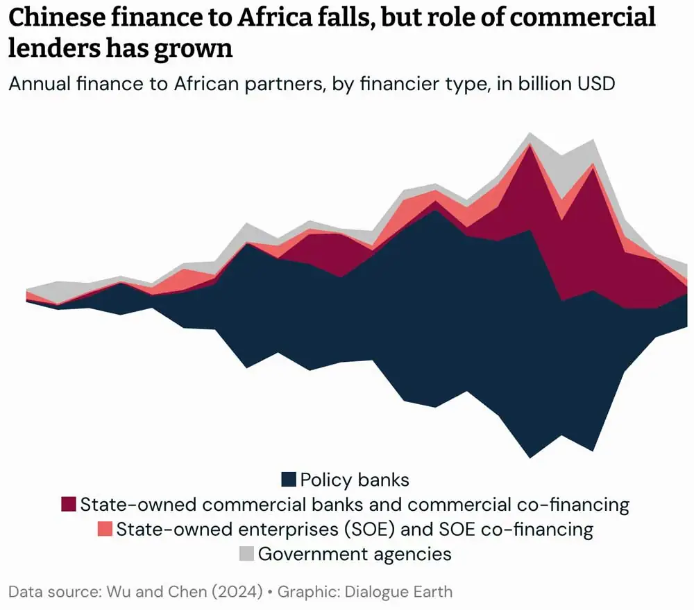 بحلول عام 2018، عندما وصلت التمويلات الصينية لأفريقيا إلى 34 مليار دولار، كانت البنوك التجارية والموردون (مثل البنك الصناعي والتجاري الصيني والشركة المملوكة للدولة سينوهيدرو) يمثلون حوالي ثلث الإجمالي.